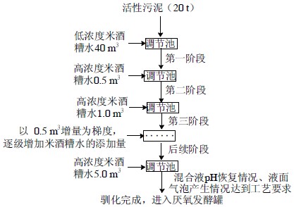 米酒糟水具有蛋白含量豐富、化學需氧量高、酸度低等特點,目前市場上還很難找到專一的厭氧菌能有效的消化分解米酒糟水。本公司采取的辦法是緩慢馴化并逐級擴培,最終得到足夠量的、可以有效消化分解米酒糟水的厭氧菌種,菌種來源為興寧市污水處理廠活性好氧污泥。規模化菌種馴化流程如圖2 所示。