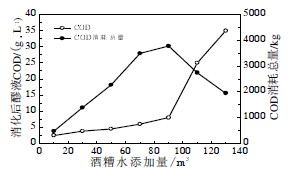 圖3 酒糟水添加量與COD 去除效果的關系