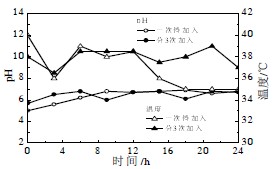 當厭氧發酵罐正式運行后,厭氧罐內厭氧細菌占有絕對優勢地位,且新陳代謝旺盛、活力優良,同時對待消化物(米酒糟水)具有良好的適應性。但酒糟水是經過釀酒車間蒸餾后排出的,酒糟水的溫度較高,待準備進厭氧發酵罐處理時,酒糟水的溫度約在60 ℃,同時酒糟水pH 較低,約為3.5,一次性加入90 m3酒糟水對厭氧罐內的環境勢必影響較大。90 m3酒糟水24 小時內一次性加入與均分3 次加入對厭氧罐內pH、溫度影響對比如圖4 所示。