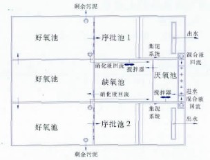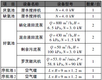 ②改進型MSBR 池。水解酸化池出水進入改進型MSBR 池,在厭氧池與回流污泥混合,富含磷的污泥在厭氧池進行釋磷反應后進入缺氧池,缺氧池用于反硝化脫氮,原水提供碳源,由主曝氣池至缺氧池的回流系統提供硝態氮。缺氧池出水進入主曝氣池經有機物降解、硝化、磷吸收反應后再進入序批池1 或序批池2。兩個序批池交替作為沉淀出水和好氧反應單元。