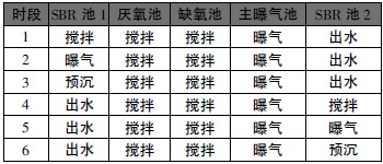 每座改進型MSBR 系統由5 個單元組成,缺氧池、厭氧池、主曝氣池始終處于連續運行狀態,SBR池1 和SBR 池2 交替運行,一個運行周期為4 h。其中各時段的持續時間: 時段1 和時段4 為30 min;時段2 和時段5 為60 min; 時段3 和時段6 為30min。