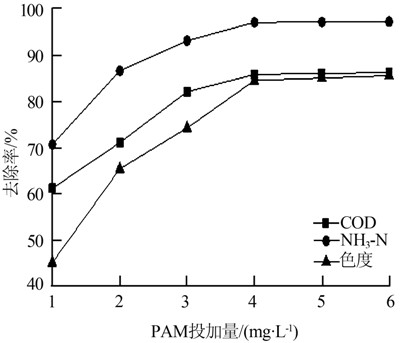 由圖 4可知,PAM投加量對焦化生化廢水的處理效果有一定的影響。隨著PAM投加量的增加,COD、NH3-N和色度去除率均升高,當PAM投加量﹥ 4.0 mg/L時,COD、NH3-N和色度去除率的升高幅度不大。從PAM的降解性、處理效果和試劑的消耗等方面綜合考慮,選擇PAM投加量為4.0 mg/L較為適宜。具體參見http://www.xhxdt.com更多相關技術文檔。