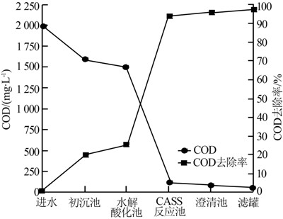 由圖 2可知,在系統正常運行過程中,初沉池、水解酸化池、CASS反應池、澄清池和濾罐的平均出水COD分別約為1 600、1 500、110、80、55 mg/L,整個系統COD總去除率可達97.3%,處理效果較佳。
