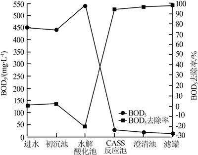 由圖 3可知,在系統正常運行過程中,初沉池、水解酸化池、CASS反應池、澄清池和濾罐的平均出水BOD5分別約為440、540、25、18、10 mg/L,整個系統BOD5總去除率可達97.8%,處理效果較佳。