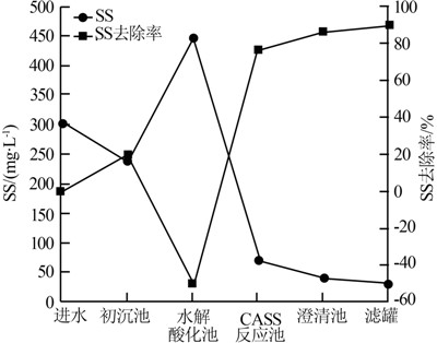 由圖 4可知,在系統正常運行過程中,初沉池、水解酸化池、CASS反應池、澄清池和濾罐的平均出水SS分別約為240、450、70、40、30 mg/L,整個系統SS總去除率可達90.0%,處理效果較好。