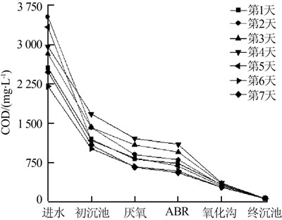 將系統(tǒng)連續(xù)運(yùn)行1周的各工段出水COD數(shù)據(jù)繪制成圖,如圖 3所示。