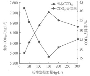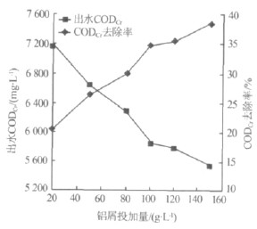 取6 份等體積的水樣,pH=12.06,依次加入20 ~150 g/L 的鋁屑,均加入200 g/L 活性炭顆粒,攪拌反應2 h,調節反應后溶液pH 至7~8,靜置沉淀1 h后,測定上清液中的CODCr,考察鋁屑投加量對鋁炭微電解處理效果的影響,結果如圖2 所示。