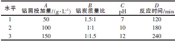 以pH、鋁屑投加量、鋁炭質量比、反應時間為影響因素,對Al/C 微電解法處理印染廢水進行了4 因素3 水平正交實驗。各因素及水平見表2,正交實驗結果見表3。