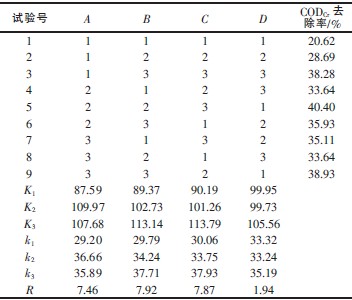 由極差分析可知,影響CODCr去除率的各因素的主次關系:鋁炭質量比>pH>鋁屑投加量>反應時間,CODCr去除率達到最高的最佳水平組合為A2B3C3D3。結合單因素實驗和運行成本,確定該預處理適宜的反應條件:鋁屑投加量為100 g/L,鋁炭質量比為1∶1.5,pH 為12.06,反應時間為2 h。