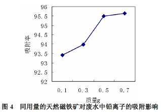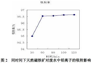 從圖5可以看出磁鐵礦對(duì)鉛離子的吸附作用當(dāng)粒徑在220目以下時(shí),去除率最高,吸附基本達(dá)到飽和。
