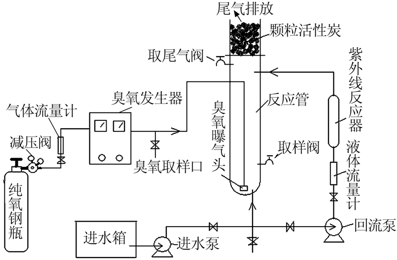 實(shí)驗(yàn)裝置由課題組自行設(shè)計(jì),杭州之江水處理設(shè)備廠生產(chǎn),其主要特點(diǎn)是O3氧化和UV光催化作用分立進(jìn)行、動(dòng)態(tài)循環(huán)。該裝置主要的工作流程為:(1)開(kāi)啟進(jìn)水泵將染料廢水泵入反應(yīng)器中;(2)開(kāi)啟氧氣瓶,根據(jù)實(shí)驗(yàn)需要調(diào)氣體流量;(3)開(kāi)啟臭氧發(fā)生器;(4)打開(kāi)回流泵,開(kāi)啟紫外線反應(yīng)器進(jìn)行UV光催化反應(yīng);(5)實(shí)驗(yàn)尾氣經(jīng)過(guò)顆;钚蕴课胶笈懦。該裝置簡(jiǎn)單易操作且尾氣經(jīng)過(guò)吸附處理后排放,具有明顯的經(jīng)濟(jì)效益和環(huán)境效益。