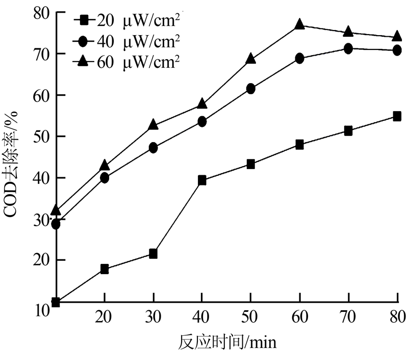 此外,由圖 4和20、40、60 μW/cm2紫外線照射強(qiáng)度下COD去除率的標(biāo)準(zhǔn)偏差(分別為±16.7%、 ±15.5%、±15.5%)可知,紫外線照射時(shí)間對(duì)染料廢水有機(jī)污染物去除效果影響顯著。