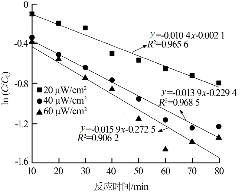 紫外照射強(qiáng)度為60、40 μW/cm2時(shí)的反應(yīng)速率要明顯高于照射強(qiáng)度為20 μW/cm2時(shí)的反應(yīng)速率,其反應(yīng)速率常數(shù)K分別為0.015 9、0.013 9、0.010 4 min-1,半降解時(shí)間(t=t1/2)分別為43.6、49.9、66.6 min。由此表明:在同等條件下,適當(dāng)增強(qiáng)紫外線照射強(qiáng)度將助于加快臭氧紫外降解染料廢水中有機(jī)污染物的反應(yīng)速率,這主要是由于高強(qiáng)度的紫外線照射加快了 ·OH等強(qiáng)氧化基團(tuán)產(chǎn)生與消耗的鏈?zhǔn)椒磻?yīng)速度。
