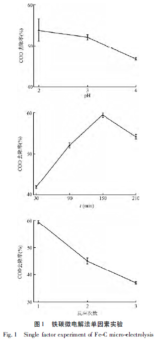 鐵碳對該類廢水的COD 降解存在一個最佳反應(yīng)時間,在這之前降解率與反應(yīng)時間正相關(guān),之后表現(xiàn)為不明顯下降。這與鐵碳填料中碳的吸附有關(guān),在鐵碳反應(yīng)的初始階段,酸性條件會導(dǎo)致鐵的大量消耗,而碳會在此期間進(jìn)行大量的污染物吸附,該階段主要以吸附為主,尚未形成鐵碳原電池,處理效果相對較低。隨著反應(yīng)時間的增加,碳的吸附量飽和后與鐵形成原電池,處理效率明顯,出現(xiàn)一個最佳的反應(yīng)時間點。
