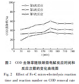 COD 降解率隨鐵碳反應(yīng)時間的增加而升高,隨反應(yīng)次數(shù)的增加而降低。首次反應(yīng)的鐵碳往往處理效率極高,但隨著反應(yīng)次數(shù)的增加會逐步降低,實驗過程中鐵碳填料在反應(yīng)容器中的下降現(xiàn)象表明了這與鐵碳填料中鐵的消耗量有關(guān)。然而經(jīng)過多次反應(yīng)后,鐵碳微電解反應(yīng)仍能保持一定的處理效果并趨于穩(wěn)定。