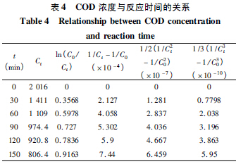 由各反應(yīng)級數(shù)的回歸分析可知,采用三級反應(yīng)動力學(xué)方程來擬合鐵碳微電解化學(xué)反應(yīng)過程動力學(xué)線性相關(guān)性最好,相關(guān)系數(shù)最高,因此可以推斷鐵碳微電解降解COD 的反應(yīng)可能遵從三級化學(xué)反應(yīng)動力學(xué)。