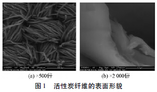 圖1 為ACF 的表面形貌,可以看出,制得的活性炭纖維呈纖維狀(纖維橫截面為橢圓,其長軸為11.7μm,短軸為2.6 μm),具有一定的溝槽和凹坑,多孔結構可為吸附質提供足夠的吸附空間,有利于吸附反應的進行。ACF 的pHpzc=5.93,其表面積為818.75m2/g,平均孔徑為1.93 nm,屬于微孔結構,微孔孔容所占比例為58. 8%。元素分析結果顯示,碳含量為85.08%,說明其碳化程度比較充分。