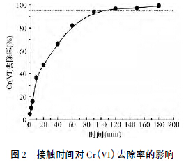 由圖可知,吸附初期吸附速度較快,前20 分鐘Cr(VI) 去除率由0 增至48.2%,20 ~120 min Cr-(VI) 去除率增加變緩,120 min 時Cr(VI) 去除率為96.6%,之后溶液中Cr(VI) 去除率變化不大。這是由于吸附初期大量的吸附位點對Cr(VI) 有強烈的吸引,隨著時間的延長Cr(VI) 去除率隨時間的變化趨緩,并最終達到吸附平衡。為保證吸附達到平衡,后續實驗選擇吸附時間為180 min。