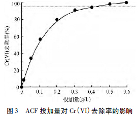 Cr(VI) 初始濃度為1.0 mg/L,ACF 投加量分別為0、0.01、0.05、0.10、0.10、0.20、0.30、0.40、0.50和0.60 g ACF/L 廢水,吸附溫度293 K,吸附時間為180 min,考察ACF 投加量對Cr(VI) 去除的影響,結果見圖3。