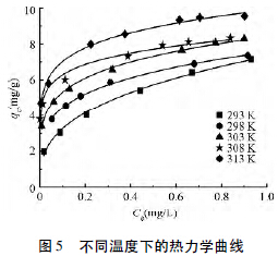 在轉速200 r/min 條件下,考察Cr(VI) 在293K、298 K、303 K、308 K 和313 K 下的吸附等溫線(見圖5) 。結果表明,ACF 對Cr(VI) 的吸附容量隨平衡濃度的增大而增大,在293 K 時,Cr(VI) 平衡濃度由0.017 mg/L 增至0.930 mg/L 時,ACF 的吸附容量由1.986 mg/g 增加到7.167 mg/g。在293 K到313 K 范圍內,吸附容量隨溫度升高而增大,說明ACF 對Cr(VI) 的吸附為吸熱反應。