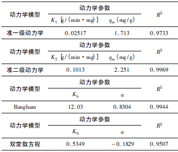 為研究ACF 對Cr(VI) 的吸附動力學,分別用準一級反應動力學方程、準二級反應動力學方程、Bangham 和雙常數方程對ACF 凈化吸附Cr(VI) 的數據進行擬合。