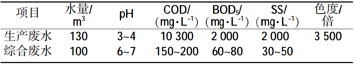 江西某化工廠廢水主要為生產廢水及綜合廢水。生產廢水主要來自生產過程中的減壓濃縮、過濾及清洗原藥過程,廢水中主要含有哌嗪、甲苯、乙酸乙酯以及2-巰基-4,6-二羥基嘧啶等有機物質,具有COD濃度高、可生化性較差﹑色度高及毒性大等特點。綜合廢水包括生產冷卻水及生活污水。化工廠廢水水質如表 1所示。