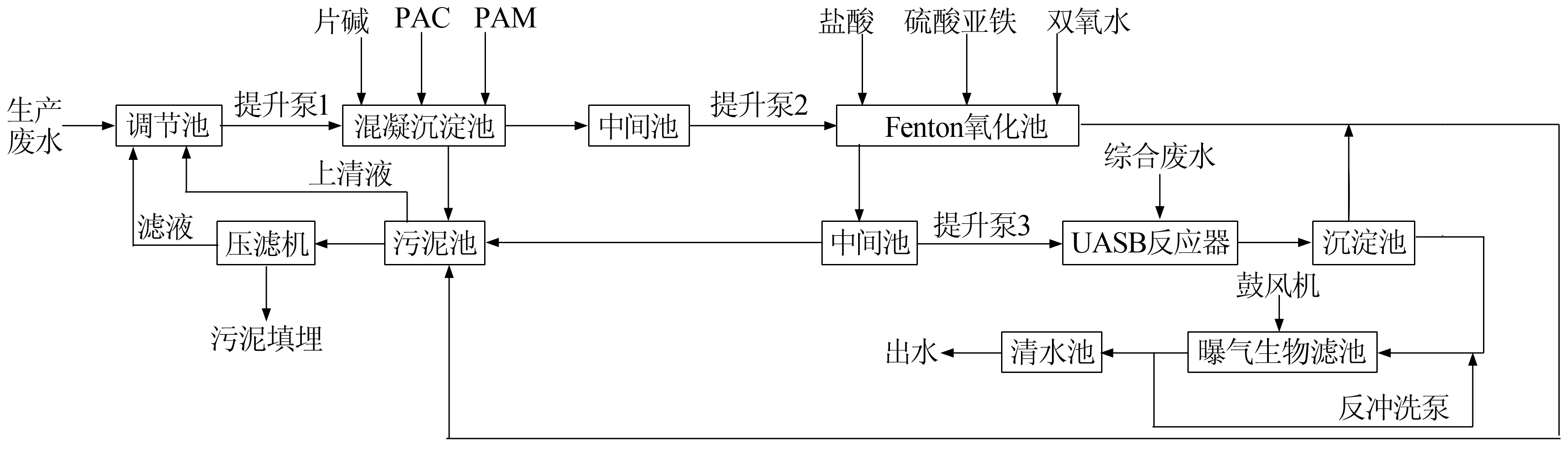 廢水處理站正常運行時,從車間排放的130 m3生產廢水首先通過企業污水管網經格柵由提升泵提升到調節池,后由提升泵1提升到混凝沉淀池,開啟攪拌器,用氫氧化鈉調節pH至7左右,投加PAC+PAM后靜置一段時間出水。混凝沉淀池出水經中間池進入到Fenton氧化池,先用鹽酸調節pH至3左右,按一定比例投加硫酸亞鐵與雙氧水,攪拌1 h,靜置2 h后出水。Fenton氧化池出水與100 m3車間綜合廢水依次進入UASB,后提升到曝氣生物濾池。經混凝、Fenton氧化、UASB、曝氣生物濾池處理后的廢水進入清水池。出水達到《污水綜合排放標準》( GB 8978 —1996)的一級標準,可外排也可增加動力消毒后進行回用。