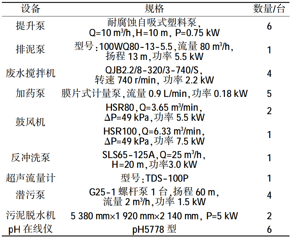 污泥池1座,采用地上鋼砼結構,帶防腐處理,設計尺寸為1.5 m×1.5 m×1.5 m。廢水處理過程中產生的污泥靠排泥泵排入污泥池,自然沉降后所得固體廢渣再經螺桿泵泵入污泥脫水機,污泥池的上清液和污泥脫水機的濾液返回調節池。