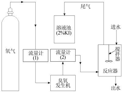 試驗用水為川中某油井經混凝預處理后的鉆井廢水,其水質:COD 890 mg/L,油類4.5 mg/L,揮發酚0.38 mg/L,SS 130 mg/L,pH 8.5。制取臭氧的原料為純氧(純度99.99%,成都新炬化工有限公司),由CFJ-5型臭氧發生器(成都斯塔瑞測控工程有限公司)產生,氣相中的臭氧濃度采用碘量法測定。