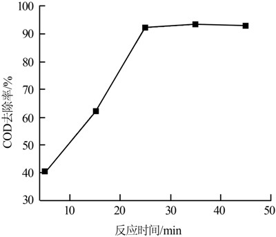 由圖 6可知,隨著體系反應時間的延長,COD去除率快速升高,當反應時間為25 min時,COD去除率可達到92.35%,繼續延長反應時間,COD去除率的變化趨于平緩。綜合考慮處理成本和降解效果,選擇25 min為最佳反應時間。