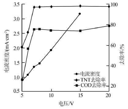 由圖 1可見(jiàn),TNT去除率隨電壓的增大而增加。電壓與電流密度成線性關(guān)系,所以TNT的去除率隨電流密度的增加而增加。但是電流密度的增加,會(huì)導(dǎo)致反應(yīng)超電壓升高,能耗提高;另一方面,在H2O2-e=HO2·+H+的反應(yīng)中,雖然生成的HO2·也是一種氧化劑,但其氧化能力大大低于HO· 。廢水在電壓為7 V時(shí),電流效率最高,此時(shí)反應(yīng)迅速,陽(yáng)極有大量氣泡冒出,此時(shí)TNT去除率為98.22%,COD去除率為75.62%。當(dāng)電壓大于7 V時(shí)反應(yīng)更換為劇烈,但是副反應(yīng)現(xiàn)象明顯,陰陽(yáng)極均有大量氣泡冒出,極板明顯發(fā)熱。這就是電壓升高較大而去除率卻上升緩慢的原因。因此從節(jié)能與廢水處理兩方面綜合考慮,最適合的電壓定為7 V。