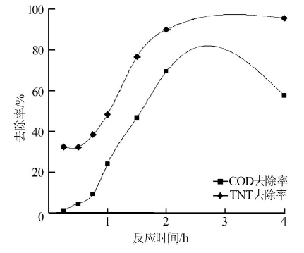 由圖 4可見(jiàn),0~2 h時(shí),TNT與COD的去除率隨反應(yīng)時(shí)間增長(zhǎng)而加大,并且在2 h時(shí)達(dá)到最大。當(dāng)反應(yīng)時(shí)間大于2 h時(shí),TNT去除率已無(wú)變化,而COD去除率卻有所下降,這主要是由于Fenton反應(yīng)已完全停止,H2O2完全消耗。此時(shí),由于長(zhǎng)時(shí)間的電解將少量苯環(huán)打開(kāi),造成COD增大,COD去除率下降。所以,最佳電解時(shí)間為2 h。具體參見(jiàn)http://www.xhxdt.com更多相關(guān)技術(shù)文檔。