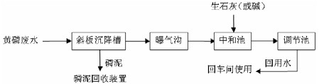 該處理工藝流程為:從制磷車間受磷槽、漂洗精制槽出來的黃磷廢水進入斜板沉降池,進行泥水分離回收磷泥,廢水從斜板沉降池上部溢流出通過曝氣溝氧化去除部分元素磷,再進入中和池與生石灰(或燒堿)中和調節pH,然后進入調節池,最后由泵抽回車間使用。處理工藝流程圖如圖2。