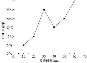 反應時間也是微電解反應的一個主要影響因素[5]。由圖3 可知,隨著反應時間的增加,COD去除率隨著升高,但是當反應時間增加到一定程度時,COD去除率并沒有明顯提升,而是穩定在一定的范圍,并且出現小幅度的波動,這是由于填料中的活性炭對有機物的吸附和脫附所致,綜合考慮處理效果和設備造價,反應時間取30 min。