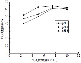 按照經典的Fenton 反應理論,Fenton 氧化必須在酸性條件下進行[10],在中性或堿性條件下,Fe2+以氫氧化物的形式沉淀而失去催化效果。由圖4,在4 個相同的H2O2 投加量下,當pH=4 時,COD去除最高,其次為pH=2,pH=6 時COD去除率最低。根據Fenton 氧化機理,存在如下反應式: