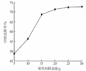 由圖4 可以看出,催化劑投加質量超過20 g后,COD 去除率變化較小,因此確定催化劑的最佳投加質量為20 g。