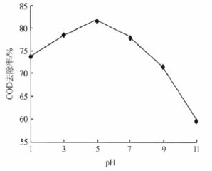 由圖5 可以看出,pH 在4~6 時,(Fe+Mn)/AC的催化活性較高,COD 的去除率均達到75%以上,并以pH=5 時最高。因此確定本試驗廢水最佳pH=5。