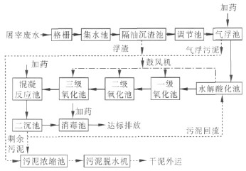 根據屠宰廢水的特點,采用以水解酸化/三級生物接觸氧化為主的處理工藝,具體工藝流程如圖1所示。