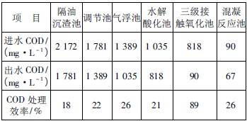 按照屠宰廢水設計工藝流程,對關鍵設備如機械格柵、污水提升泵、羅茨鼓風機等在充水后進行單機調試。然后對各處理單元(調節池、氣浮、水解酸化、好氧處理、污泥濃縮等) 進行調試。生物處理系統以生活污水作為培養水源,分別注入水解酸化池與各級生物接觸氧化池中。投加后按照正常水位條件,連續悶曝3 ~ 7 d,曝氣期間不進水。在確定微生物生化條件正常時,即可開始進廢水,進水量由小到大逐漸調節,使微生物逐步適應。在對微生物進行培養馴化的過程中,以一定的比例投加氮、磷等營養物質,促進菌種的生長與掛膜。連續進水近3 個月,廢水處理系統排放口出水清澈,呈微黃色。通過監測各主要處理構筑物進、出水COD(見表4) 與排放口出水各污染物指標(見表5) 可知,該廢水處理系統運行穩定,出水水質優于《肉類加工工業水污染物排放標準》(GB 13457—92) 的一級標準。該工程于2009 年9 月通過當地環保部門驗收,至今仍穩定運行。