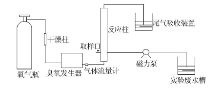 實驗在容積為12 L的有機玻璃反應柱中進行,實驗裝置見圖 1。臭氧發生器(CF-G-3-010g,青島國林臭氧裝備有限公司)以工業純氧氣為氣源,臭氧產量3~10 g/h,經過臭氧發生器產生的O3通過反應柱底部鈦板均勻曝氣,尾氣采用KI溶液吸收。