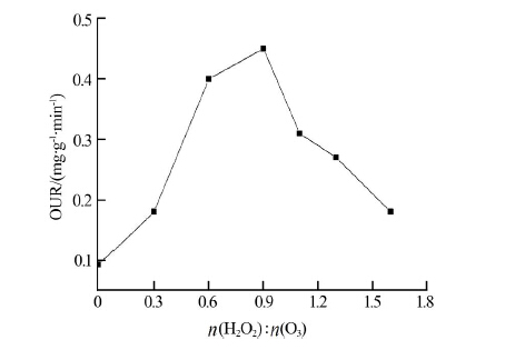在反應溫度20 ℃、廢水初始OUR為0、pH為10.5、反應時間30 min、臭氧投加量4.2 mmol/L的條件下,考察n(H2O2)∶n(O3)對廢水可生化性的影響,結果見圖 2。相同實驗條件下單獨臭氧氧化出水OUR為0.093 mg/(g·min),單獨雙氧水氧化出水的OUR為0.08 mg/(g·min),而n(H2O2)∶n(O3)為0.3、