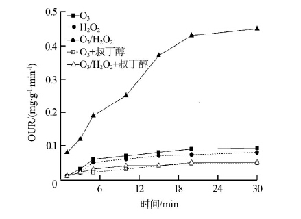 由圖 3可知,反應時間為30 min時單獨臭氧氧化出水的OUR為0.093 mg/(g?min),加入15 mg/L叔丁醇后出水OUR下降為0.04 mg/(g·min)。在臭氧氧化工藝中加入雙氧水后,廢水的可生化性明顯提高,反應30 min后出水OUR升高到0.45 mg/(g·min),而向水中引入15 mg/L叔丁醇后廢水的可生化性明顯降低,低于臭氧和雙氧水分別單獨氧化時的水平。由此表明叔丁醇的存在有效抑制了水中羥基自由基的生成。實驗結果間接證明在雙氧水與臭氧協同氧化過程中,雙氧水能夠加速臭氧分解產生羥基自由基,鏈式反應見式(1)~式(6),羥基自由基進而氧化廢水中的有機物,從而提高廢水的可生化性。