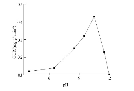溶液pH能夠影響有機物的存在形態、臭氧的溶解程度、分解速率以及羥基自由基的生成狀況,因此是影響O3/H2O2協同氧化的一個重要因素。圖 4為臭氧投加量4.2 mmol/L、n(H2O2)∶n(O3)=0.9、反應溫度20 ℃、反應時間30 min條件下溶液pH對廢水可生化性的影響。從圖 4可以看到隨著pH的增大出水OUR呈現先升高后降低的趨勢。廢水初始pH為10.5時,反應30 min后出水OUR達到最大。但當pH> 10.5 時,出水OUR隨溶液pH 升高而降低。這是因為在羥基自由基生成的鏈反應中,較高濃度的HO2-有利于羥基自由基生成,而堿性條件下過氧化氫更容易離解為HO2-,從而對羥基自由基生成鏈反應起促進作用,有利于氧化分解廢水中難降解有機物,從而提高廢水的可生化性,表現出較高的出水OUR。然而強堿性條件下 HO2- 又會快速離解為較不活潑的O2- ,導致O3利用率下降,出水OUR降低。因此在O3/H2O2協同氧化預處理克林霉素廢水時,最佳pH為10.5左右。