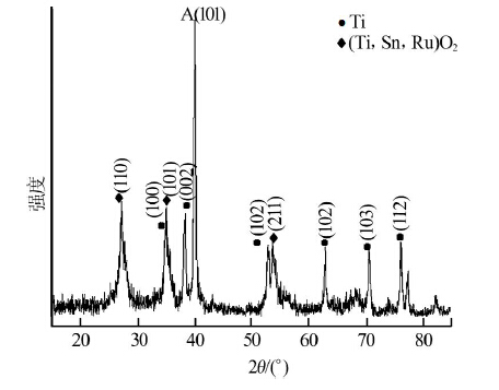 圖2是熱處理后的Ti/TiO2-SnO2-RuO2電極XRD譜圖。在2θ為35.09°、38.42°、40.17°處出現Ti的(100)、(002)、(101)晶面的特征衍射峰,與標準卡片00-044-1294相吻合。在2θ為27.17°、35.59°、53.65°的位置出現TiO2的(110)、(101)和(211)晶面的特征衍射峰;在2θ為27.16°、34.77°、53.08°的位置出現SnO2的(110)、(101)和(211)晶面的特征衍射峰;在2θ為27.65°、35.21°、53.92°的位置出現RuO2的(110)、(101)和(211)晶面的特征衍射峰。上述衍射峰的位置分別與金紅石結構的 TiO2、SnO2、RuO2 3種氧化物相吻合,這3種氧化物具有金紅石結構和相近的晶格常數,有利于固溶體的形成。這種固溶體的形成對鍍層能夠起到良好的過渡作用,同時還可以通過減小鍍層之間的應力來提高電極的穩定性,延長電極使用壽命。