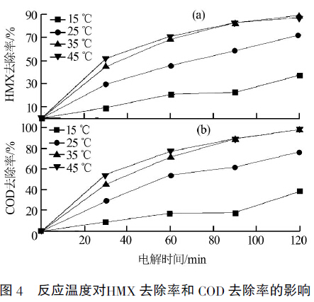 (2)電解反應溫度對HMX處理效果的影響。反應溫度是電催化降解有機廢水的重要影響因素。在Na2SO4質量濃度為7.5 g/L、溶液pH為7、外加電解電壓為3 V(極板間距1 cm)的條件下,用Ti/TiO2-SnO2-RuO2電極電催化降解HMX炸藥廢水,考察反應溫度分別為15、25、35、45 ℃時對HMX和COD的去除率,如圖4所示。
