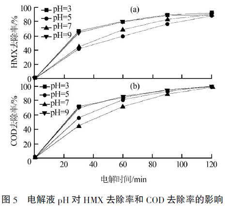 從圖5可以看出,在實驗考察的pH范圍內,電極對HMX和COD的去除率均隨時間的延長而增大,去除率均較高。當溶液pH在3 ~ 7的酸性范圍內,相較于其他幾個pH,反應溶液pH為3時去除效果最好。電解120 min時,HMX去除率為91.76%,COD去除率達到99.86%。當反應溶液為堿性(即pH為9),電解120 min時HMX去除率為89.63%,COD去除率達到99.05%,略低于酸性條件,因此確定降解反應的最佳pH為3。