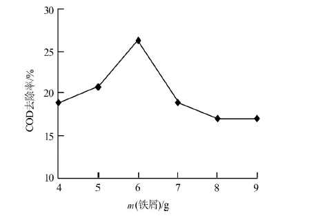 (2)鐵屑投加量的確定。分別向100 mL廢水中投加4、5、6、7、8、9 g預處理后的廢鐵屑,活性炭投加0.3 g,反應時間為16 h進行微電解反應,考察鐵屑投加量對COD去除率的影響,結(jié)果見圖 2。由圖 2可見,當鐵屑投加質(zhì)量為6 g時,COD去除率最高為25.8%,因此確定6 g為鐵屑最優(yōu)投加量。