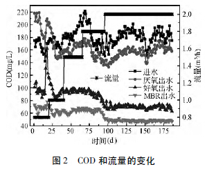 影響稠油廢水外排不達標的主要污染物為COD,本實驗采取逐漸提高流量的方式以考察停留時間對COD 去除的影響。圖2 表明,進水COD 濃度在160~220 mg/L 之間波動,經過厭氧處理140~ 180 mg/L,好氧處理后進一步降至80~100 mg/L,經過膜過濾后出水基本穩(wěn)定在60~80 mg/L,膜截留了反應池內的微生物,使反應器內的活性污泥濃度大大增加,使污染物的降解更快速徹底。同時,膜的高過濾精度,確保出水懸浮物含量低,保證了水質達標。加入少量的粉末活性炭吸附過濾,出水COD可穩(wěn)定在50 mg/L 以下。圖2 還表明,當進水流量從0.8 增加到2.0 m3/h,即停留時間從72 h 降至30 h,出水COD 基本無變化,因此最佳停留時間為30 h。