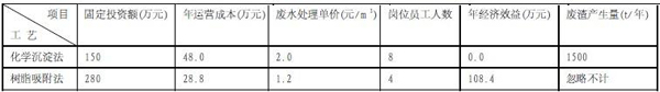 通過兩種不同工藝處理重金屬廢水效果來看,雖然出水水質均可達標,但是產生的經濟效益和社會效益卻是相去甚遠,化學沉淀法具有簡單易掌握,投資額度相對較低的特點,但是卻不可避免產生沉淀廢渣,有價重金屬進入廢渣帶來了二次污染,資源得不到充分回收利用,且廢水處理單位成本較高,人員勞動強度大;離子交換樹脂吸附法雖然一次性投資稍大,但是幾乎不產生廢渣,有價金屬可以充分得以回收利用,尤其是在對具有較高經濟回收價值的重金屬廢水處理方面具有廣闊的應用前景,其帶來的社會效應與經濟效益都值得我們加以深入研究。