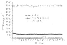 該廢水處理工藝建成后進行了調試運行,時間從2010 年6 月5 日-9 月20 日。6 月份主要進行活性污泥的接種馴化。7 月10 日左右開始通水。該廢水中的浮油、分散油、溶解油較多,因而在該工藝設計中,隔油沉淀池的穩定運行是保證該廢水處理工藝穩定運行的關鍵。在該項目運行過程中,對隔油沉淀池的運行嚴格管理。因該廢水COD 較高,同時廢水中含有大量的有機物如脂類和蛋白質。在2010 年8 月份中旬發現調節池不斷散發臭味,分析原因是由于該段時間氣溫較高,調節池中廢水由于厭氧腐化散發出臭味。通過在調節池增加曝氣設備,進行預曝氣,消除臭味帶來的影響,同時增加曝氣設施有利于后續混凝氣浮池的運行。在2010 年08 月份下旬,CASS 運行過程中發現活性污泥顏色變深,通過對CASS 反應池取樣分析,發現CASS 初始階段溶解氧質量濃度過低,大約0.5 mg/L,缺氧環境導致活性污泥顏色變深,同時出水中COD 由90 mg/L 增大到270 mg/L 左右。通過增大曝氣量,提高溶解氧質量濃度到3 mg/L 以上,出水水質不斷提高。2010 年12月11 日,檢測到出水水質變差,經分析發現是由于突然降溫至-5 ℃左右,水解酸化池微生物受到降溫的影響,活性降低,導致出水水質惡化。延長水解酸化池停留時間由6 h 提高到9 h,保證出水水質。在廢水處理工藝運行過程中,對員工的技術培訓非常重要,這也是影響該工藝穩定運行的一個重要因素。工藝調試進水期間(2010 年7 月10 日到09 月20 日)原廢水及水解酸化出水和CASS 出水COD 變化見圖2。該廢水處理工藝經調試運行,出水水質穩定,達到了設計的排放標準。各主要構筑物出水水質見表1。